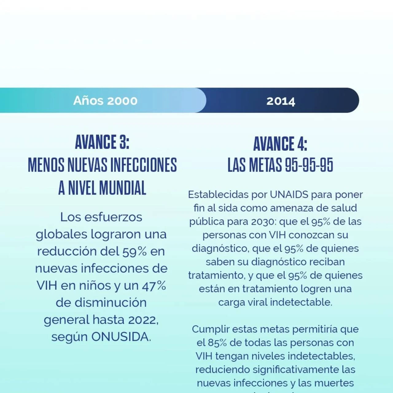 2024: Las Metas 95-95-95 de ONUSIDA. Estas ambiciosas metas buscan que, para 2030, el 95% de las personas con VIH conozcan su diagnóstico, el 95% de quienes lo saben reciban tratamiento, y el 95% de quienes están en tratamiento logren una carga viral indetectable. Cumplir con estos objetivos permitiría que el 85% de todas las personas con VIH tengan niveles indetectables, reduciendo significativamente las nuevas infecciones y las muertes, acercándonos a poner fin al SIDA como amenaza de salud pública.