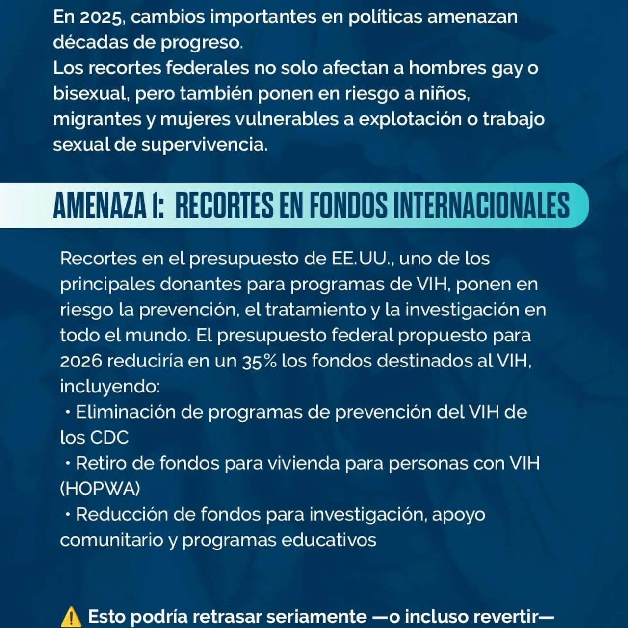 Recortes en Fondos Internacionales: Propuestas como el presupuesto federal de EE.UU. para 2026, que reduciría en un 35% los fondos destinados al VIH, son alarmantes. Estados Unidos ha sido uno de los principales donantes para programas de VIH a nivel mundial. Estos recortes no solo afectarían a hombres gais o bisexuales, sino que también pondrían en riesgo a niños, migrantes y mujeres en situaciones de vulnerabilidad, incluyendo aquellas en explotación o trabajo sexual de supervivencia. Las reducciones planteadas incluyen la eliminación de programas de prevención del VIH de los Centros para el Control y la Prevención de Enfermedades (CDC), el retiro de fondos para vivienda para personas con VIH (HOPWA), y una reducción drástica en la investigación, el apoyo comunitario y los programas educativos.