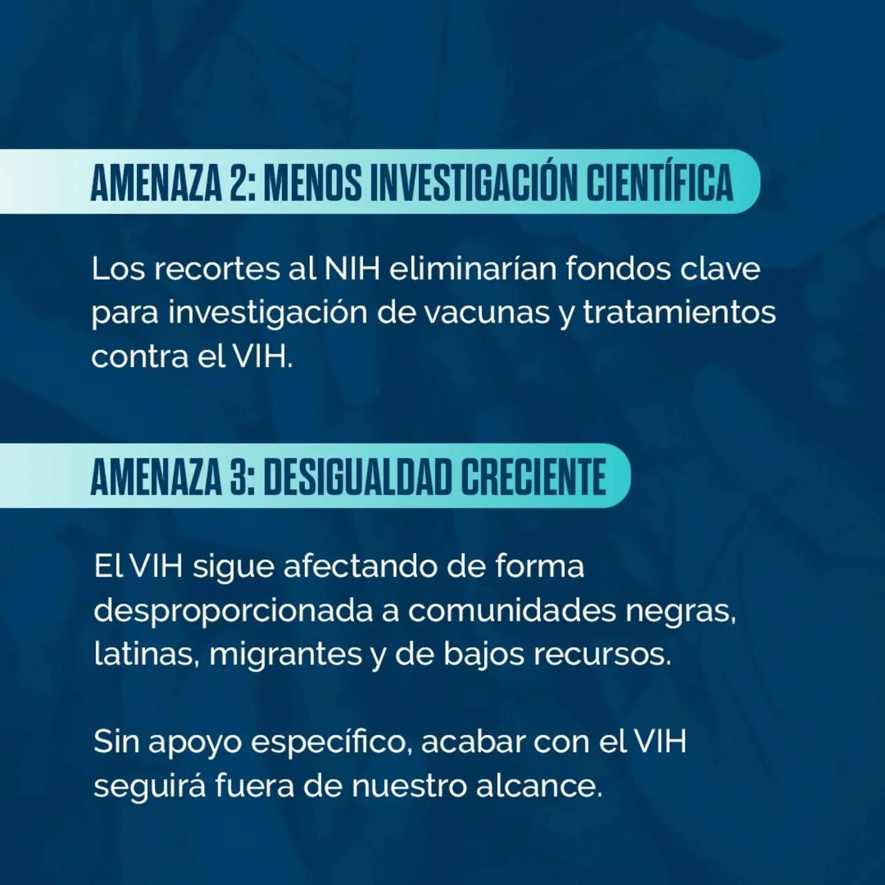 Desigualdad Creciente: El VIH sigue afectando de forma desproporcionada a comunidades marginadas como las personas negras, latinas, migrantes y de bajos recursos. Sin un apoyo específico y sostenido para estas poblaciones, la promesa de acabar con el VIH como amenaza de salud pública seguirá estando fuera de nuestro alcance. Las desigualdades existentes se exacerbarán, creando nuevas barreras para la prevención y el tratamiento.